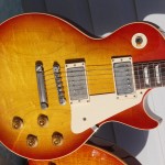 Incredible tone, it has a “honk” that is loud and resonant without plugging it in. It shimmers with good bass response and cracking mids. One of the best playing and sounding guitars I have ever owned. The notes will play what you want them to, no struggling with vibrato, and it will howell on command. Best with heavy gauge strings, on the fatter side of medium fat neck. Color looks very red in photos, but this guitar could be called a Tea Burst, There is figuring on the maple but no flame. It is certainly a book matched top. Also there is red pigment bleeding into the binding, this is vintage accurate.